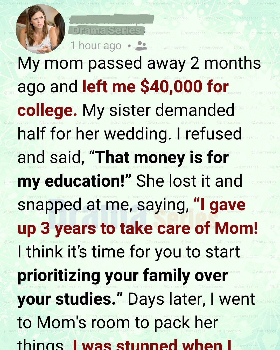 After the funeral, when the house grew quiet and the grief settled in, my stepsister Brianna demanded half of the $40,000 Mom left me for college. Mom had made me promise to use it for my education. But Brianna, newly engaged, said weddings were expensive and claimed she deserved the money because she had “sacrificed” three years caring for Mom.